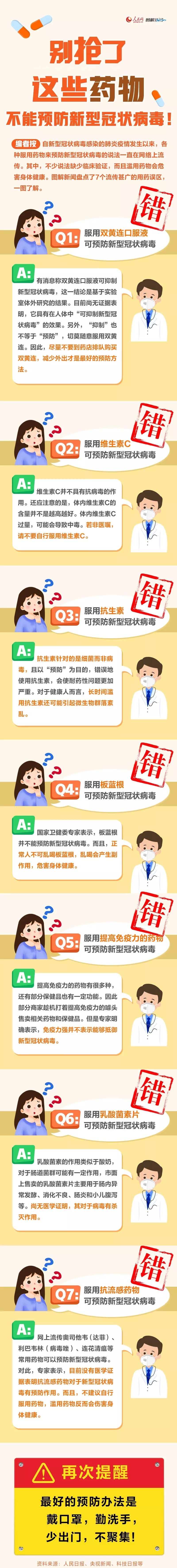 Q7: 독감치료약을 복용하면 신종 코로나바이러스 감염을 예방할 수 있다? (오류) 오셀타미비어, 비라졸 련화청온 등 상용약물이 신종 코로나바이러스 감염을 예방할 수 있다는 소문이 인터넷에 파다하다. 전문가는 지금까지 이런 약물이 신종 코로나바이러스 감염을 예방할 수 있다는 연구결과가 없다고 밝혔다. 약물을 람용하면 도리여 신체건강을 해칠 수 있다.