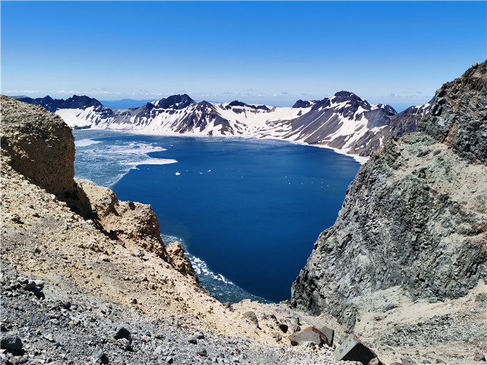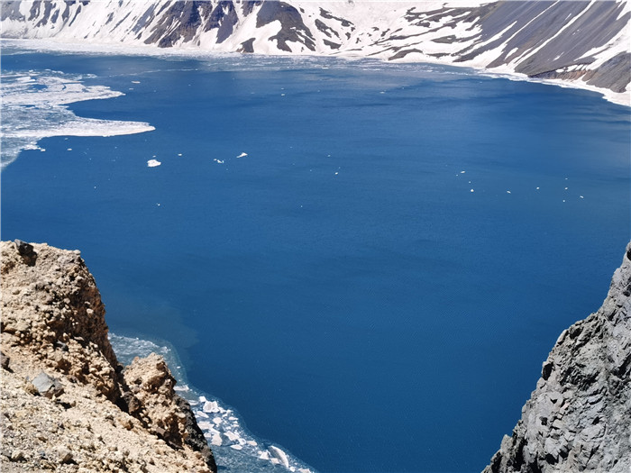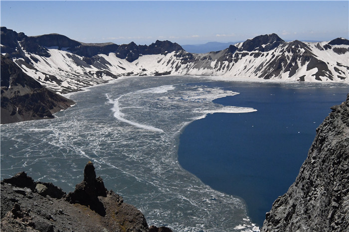 6월 11일 , 장백산 천지가 녹기 시작한 모습. 한시간에 한메터의 속도로 해빙하고 있는 천지 수면은 눈에 확연히 알릴 정도로 해빙속도가 가속화되고 있다. 장백산 천지는 세계에서 해발이 가장 높은 활화산구 호수로 해마다 12월이면 얼기 시작하고 이듬해 6월 중하순이면 얼음이 녹는다.