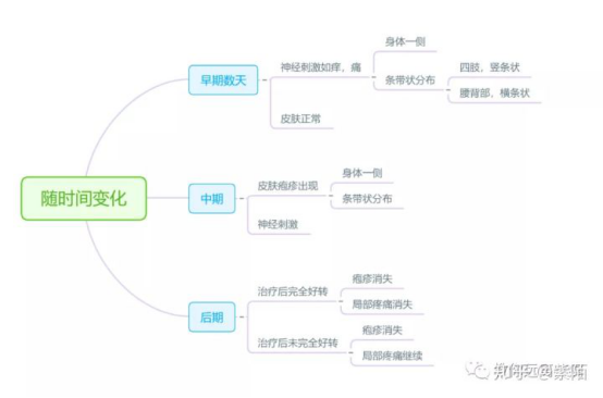 치료를 시작하면 빠르게 치유되지만 피부의 병적인 증상을 잘 관리하지 않으면 2차 세균감염이 발생하여 곪을 수 있습니다. 로인이나 면역억제 환자의 경우 피부의 이상 증상이 모두 좋아져도 포진성 통증이 남는 경우가 흔히 있으며 면역기능이 정상인 환자의 경우에도 7.9%에서 포진성 통증이 나타날 수 있습니다. 눈 주변에 대상포진이 생기는 경우에는 홍채염이나 각막염을 일으켜 실명할 수 있고 바이러스가 뇌수막까지 침투하면 뇌수막염으로 진행되기도 합니다. 면역억제환자에서는 대상포진이 지각신경이 분포하는 부위에 국한되지 않고 전신의 피부에 나타나기도 하며 뇌수막염이나 뇌염으로 진행하거나 간염이나 페염을 일으켜 사망에 이르는 경우도 있습니다. 증상이 좋아지더라도 바이러스는 잠복상태로 몸속에 계속 존재하기 때문에 바이러스가 재활성화되면 다시 대상포진이 발생할 수 있습니다.