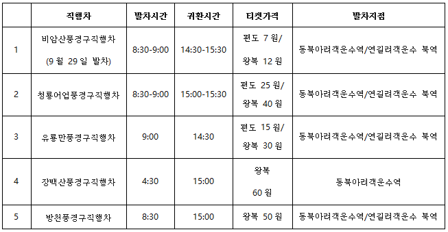일일관광 직행차 운행시간표