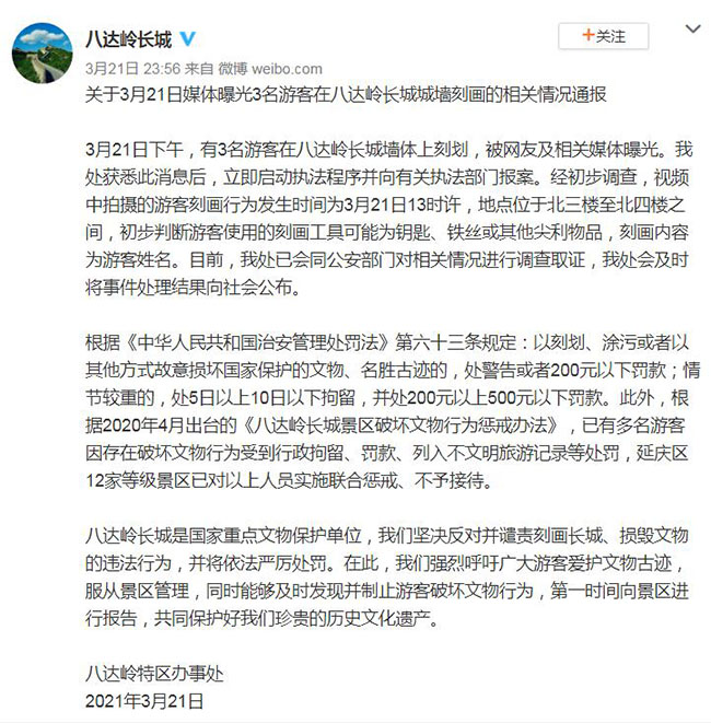 3월 22일, 팔달령특구 판사처는 21일 팔달령장성풍경명승구 공식웨이보를 통해 언론에서 폭로한 3명의 유람객이 팔달령장성 벽체에 락서한 관련 상황을 통보했다.