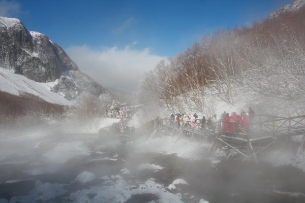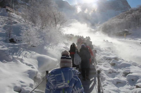 구룡온천군잔도는 사람들로 붐볐고 온천증기가 자욱하며 마치 선경과 같았다. 잔도 옆에 있는 나무들도 새하얀 외투를 입었고 고혹적인 무송으로 가득 차있었다. 관광객들은 잠시 멈춰서 휴대폰을 꺼내 장백산의 매혹적인 경치를 기록했다.