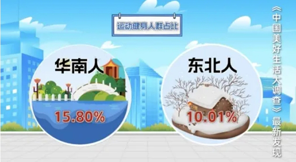7개 주요 지역의 관점에서 볼 때 여가시간에 가장 운동을 좋아하는 사람은 화남지역 사람들이며 한해동안 화남지역 사람들의 15.80%가 여가시간에 운동단련을 즐겼다. 운동을 가장 게을리 하는 사람은 동북사람으로 1년에 거의 절반은 날씨가 너무 추워서인지 이들중 운동을 하는 사람은 10.01%에 불과했다.