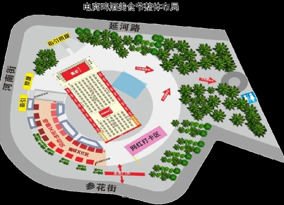 이번 행사는 맥주미식축제구, 전자상거래문화축제구, 커피문화구와 인터넷인기구 도합 4개 구역을 설치했다. 그중 맥주미식축제구는 광장의 중심에 위치하고 2,100평방메터에 달하는 맥주하우스가 설치되였으며 내부에는 무대, 미식구, 식사구가 설치되고 동시에 1,000명이 식사를 할 수 있다. 전자상거래문화축제구는 광장 동북구역에 위치해 있으며 면적이 800평방메터에 달하는데 민속체험구, 다국전자상거래구, 국내전자상거래구와 공유생방송실이 설치되여 있다. 커피문화구는 광장 동북구역에 자리잡고 있는데 면적이 200메터에 달하며 연길 커피 IP, 연길 특색 커피와 디저트를 전시하고 커피문화체험활동을 펼친다. 인터넷인기구는 광장 서북구역에 위치하고 면적이 약 1,000평방메터에 달하며 특색경관 세곳을 설치했는데 연길시 상징표지, 민족요소와 버드와이저요소를 결부하여 행사의 랜드마크를 형성하고 활력연길을 구현한다.
