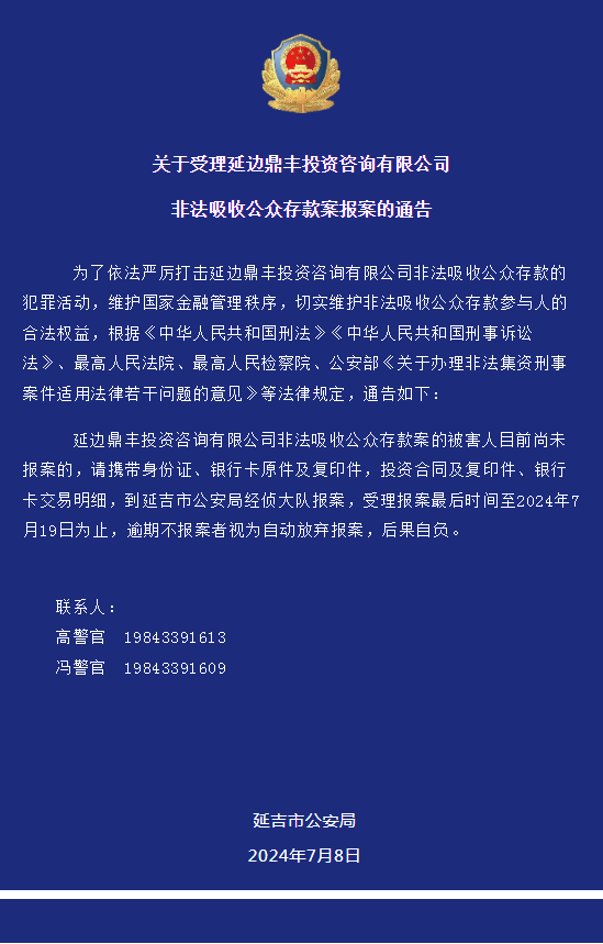 연변정풍투자자문유한회사 공중 예금 불법 흡수사건의 피해자가 지금까지 신고하지 않았을 경우 신분증, 은행카드 원본 및 복사본, 투자계약서 및 복사본, 은행카드 거래명세서를 가지고 연길시공안국 경제범죄수사대대를 찾아 신고하기 바란다. 신고 접수 마감시간은 2024년 7월 19일까지이고 기한내에 신고하지 않은 사람은 자동으로 신고를 포기한 것으로 간주하고 후과는 스스로 책임져야 한다.