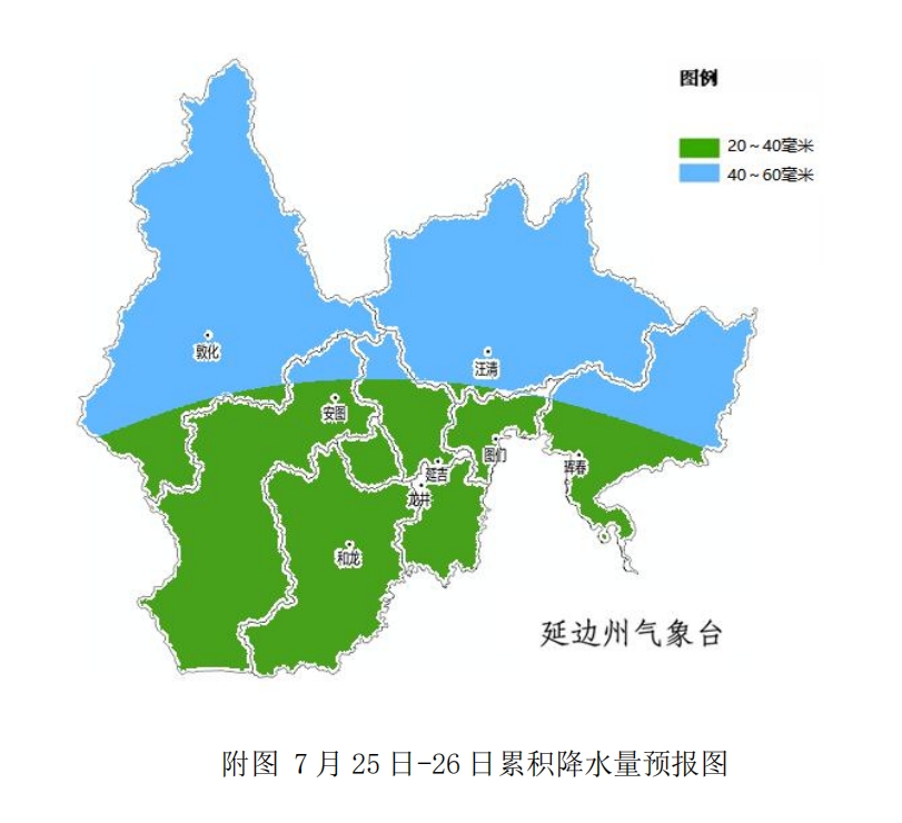 기상부문에 따르면 7월 25일 저녁부터 26일 낮까지 우리 주에는 한차례 뚜렷한 강수 과정이 있을 것으로 예상되는데 이 과정은 주로 혼합성 강수이며 일부 지역에서는 단기 강우, 천둥, 강풍 등 강대류 날씨를 동반하겠으며 비는 주로 25일 밤에 집중될 것으로 보인다. 돈화, 왕청, 훈춘 북부의 강수량은 40~60mm, 돈화 개별 지방의 강수량은 80mm 혹은 그 이상에 달하겠으며 최대 시간당 강수량은 25~35mm, 기타 지방의 강수량은 20~40mm에 달할 것으로 보인다.