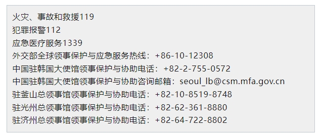 최근 한국주재 중국대사관은 한국을 방문하는 중국 고령관광객들의 갑작스러운 질병, 강제쇼핑, 팀내 락오 및 실종과 같은 예상치 못한 사건에 대한 령사보호구조를 여러번 접수했다. 이에 한국주재 중국대사관은 한국방문 고령관광객들이 다음 사항에 대해 주의할 것을 당부했다.