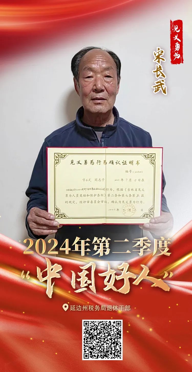 송장무. 남. 1952년 1월 출생. 중공당원. 연변주세무국 퇴직간부. 2023년 7월 15일 송장무는 연길시 천지대교 부근을 산책하다가 한 녀성이 물에 빠진 것을 발견했다. 송장무는 아무런 보호조치도 없는 상황에서 서슴없이 3메터 높이의 다리에서 뛰여내려 녀성을 구한 후 묵묵히 자리를 떴다. 송장무는 일찍 '길림 본보기' 등 영예를 받아안았다.