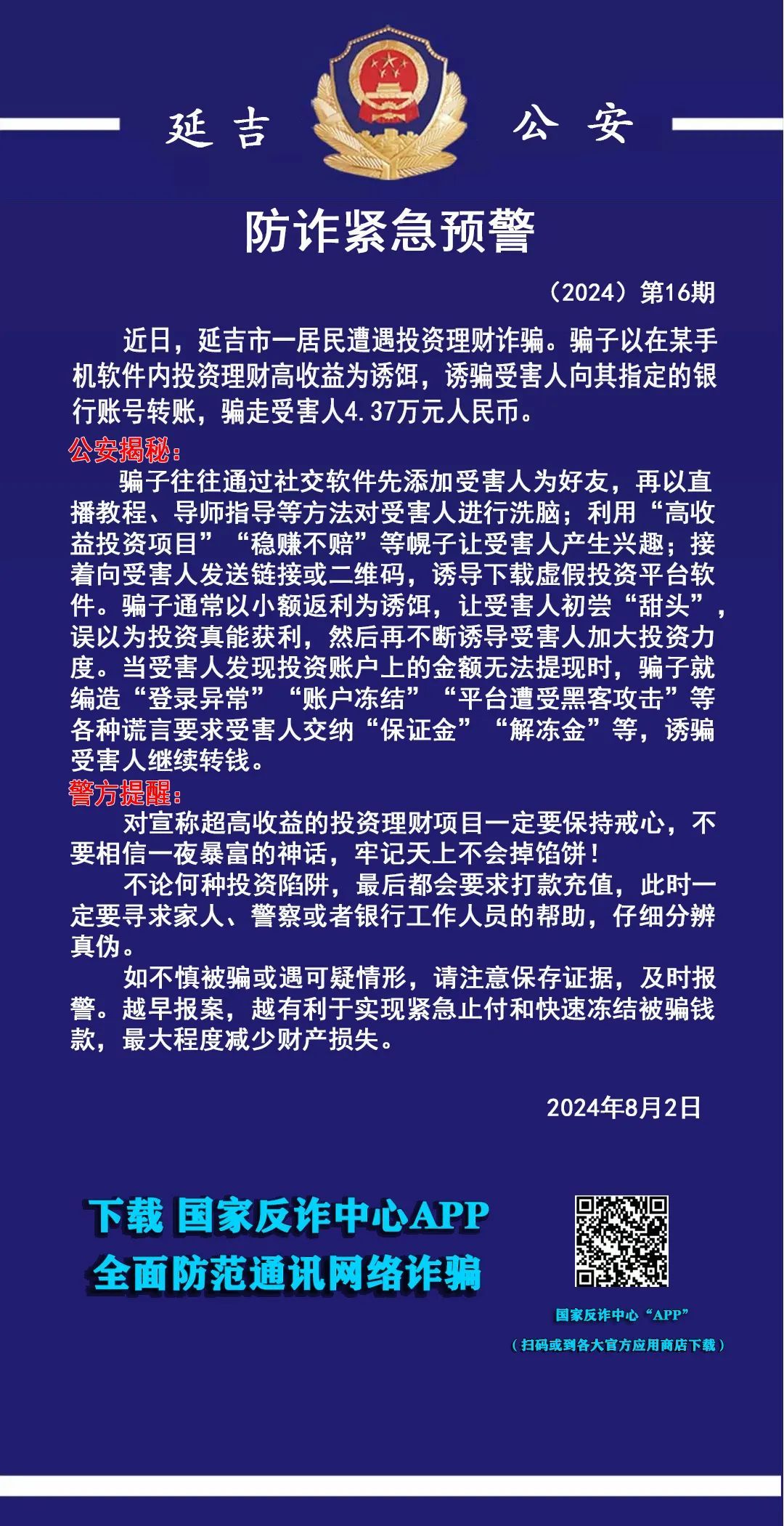 일전 연길시 한 시민이 투자 재테크 사기를 당했다. 사기군은 모 스마트폰 앱의 투자 재테크 고수익을 미끼로 피해자가 지정된 은행계좌에 돈을 이체하도록 사기를 쳤는데 피해자로부터 4.37만원을 편취했다.