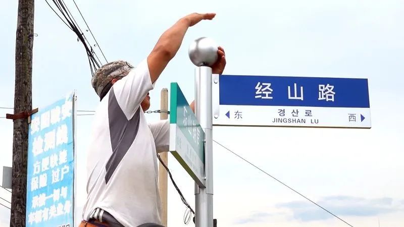 학부로와 동환로 교차로에서 사업일군들은 질서있게 설치 작업을 하고 있다. 새로운 도로 표지판은 눈에 띄고 간결하며 도시 도로와 조화를 이루어 문명도시의 독특한 '지명 명함장'을 구성했다.