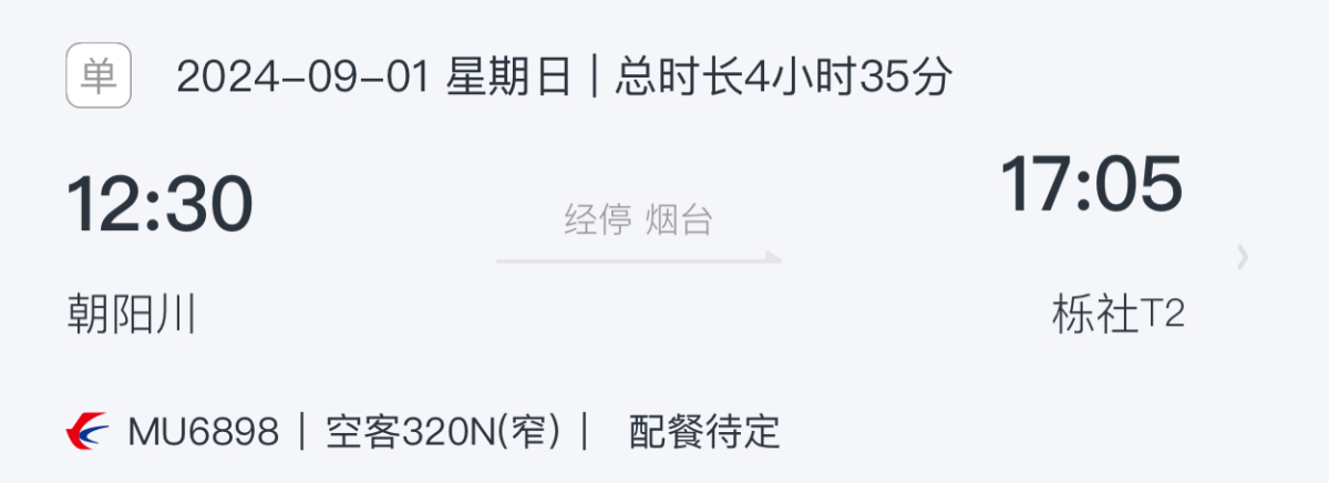 연길-녕파 MU6898, 연길조양천공항에서 12:30분에 리륙해 연태에서 50분간 머무르며 17:05에 녕파공항 T2에 착륙한다.