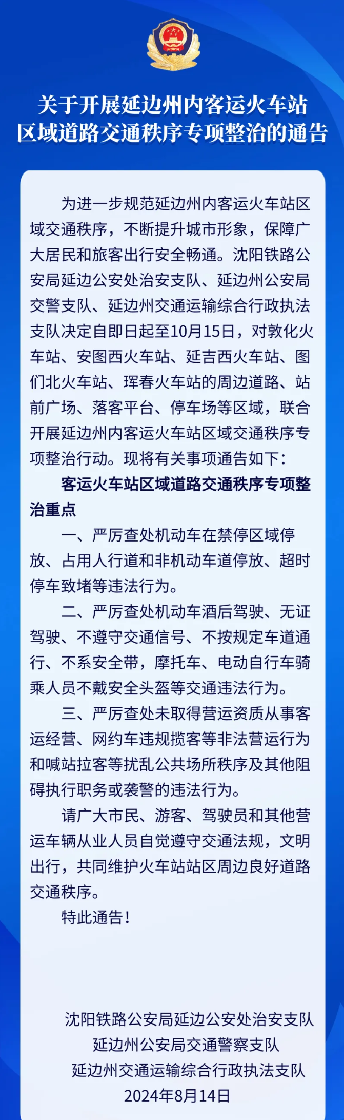 연변주내 려객운수 기차역 구역의 교통질서를 일층 규범화하고 도시형상을 부단히 향상시키며 광범한 주민과 려객의 안전하고 원활한 이동을 보장하기 위해 심양철도공안국 연변공안처치안지대, 연변주공안국교통경찰지대, 연변주교통운수종합행정집법지대에서는 지금부터 10월 15일까지 돈화기차역, 안도서기차역, 연길서기차역, 도문북기차역, 훈춘기차역의 주변도로, 역전앞 광장, 려객하차플랫폼, 주차장 등 구역에 대해 연변주내 려객운수 기차역 구역 교통질서 전문정돈행동을 전개하기로 결정했습니다. 아래 관련 사항을 다음과 같이 통고합니다.
