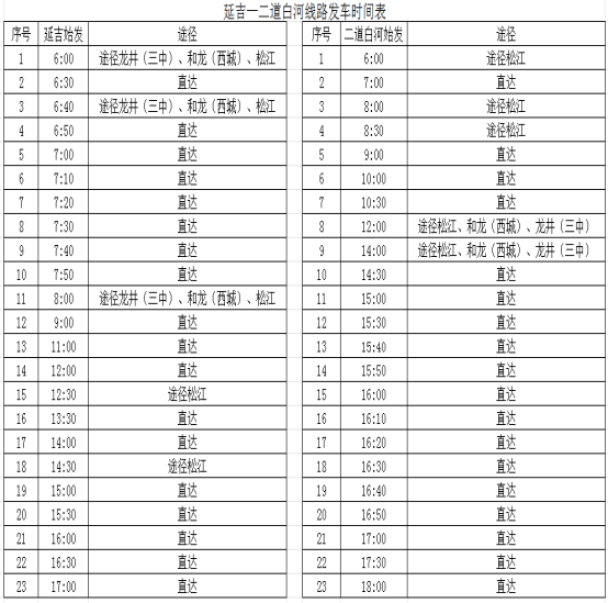 2.대부분 뻐스는 장백산 북쪽풍경구에서 고속도로로 연길까지 직행하고 일부 뻐스는 장백산북쪽풍경구집산중심에서 출발하여 비오리공원, 신달려관, 이도백하려객운수역, 송강, 연길려객운수서역, 공신은포를 거쳐 연길도로려객운수총역에 도착한다.