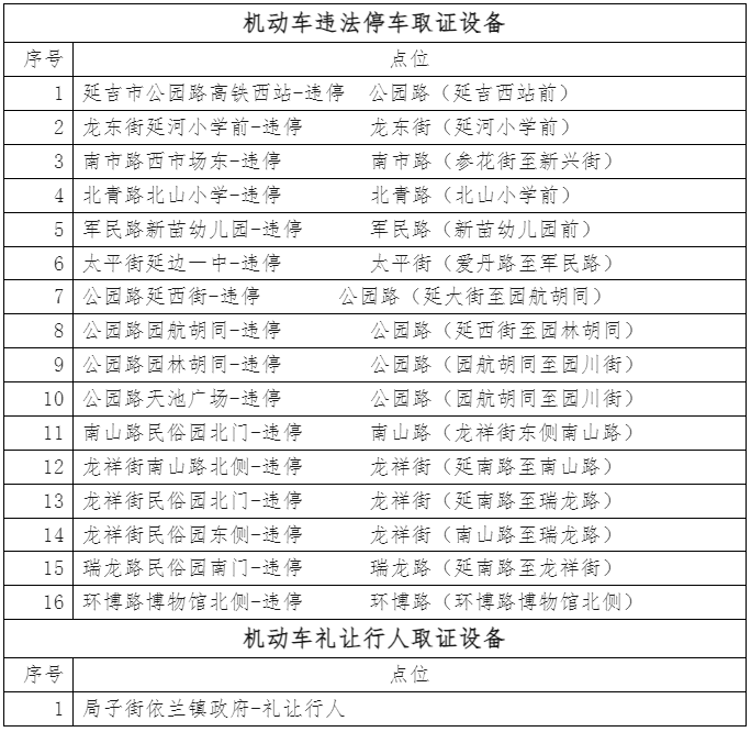 도로교통질서를 일층 수호하고 교통안전을 보장하며 도로교통사고 발생을 효과적으로 예방하기 위해 연길시공안국 교통순라경찰대대는 6곳의 위법 증거수집 설비승격을 마치고 11곳에 위법 증거수집 설비를 새로 설치했다. 공고는 아래와 같다.