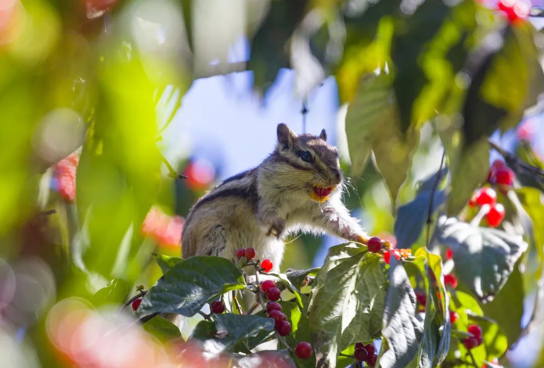 노란색 자두와 빨간색 인동덩굴도 편식하지 않고 모두 잘먹는 다람쥐의 귀여운 모습이다.
