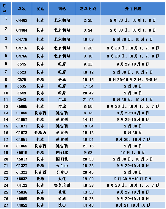 장춘역 국경절 련휴기간 림시 려객렬차 추가 운행 시간표