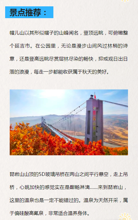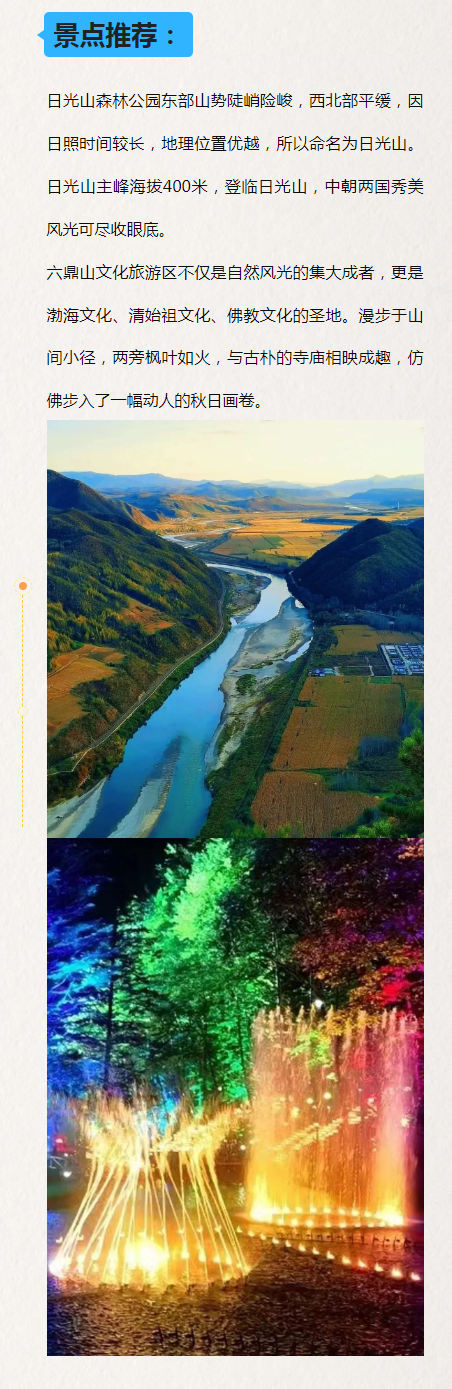 연길모아산국가산림공원→비암산문화관광풍경구→훈춘대황구생태풍경구→만천성국가삼림공원→호기문화관광리조트