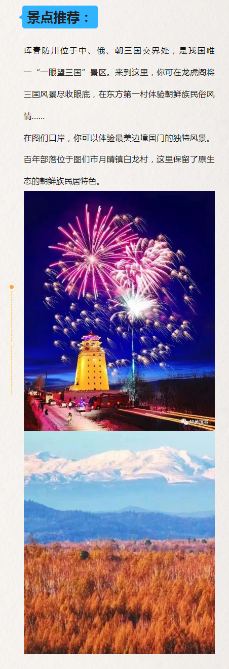 훈춘방천풍경구→방천촌(동방제1촌)→도문통상구풍경구→백년부락→삼합관광풍경구→화룡선경대국가급풍경명승구→화룡군함산풍경구→장백산홍석봉생태풍경구→장백산협곡부석림