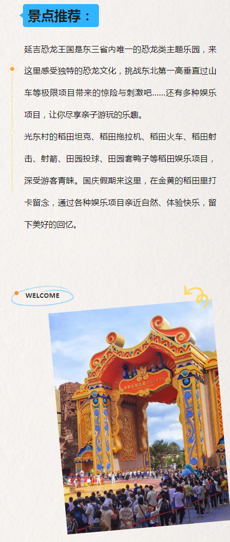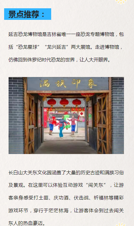 연길동래사→도문일광산삼림공원풍경구→국문생태원→돈화안명호농어락원→륙정산문화관광구→륙정산온천→장백산력사문화원→따시타이허풍경구