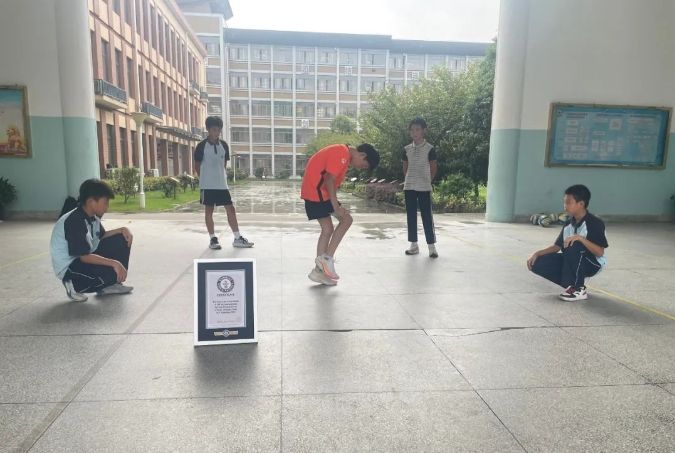 14세의 나이에 그의 줄넘기가 세계급 수준에 도달했는데 1분간 싱글스윙(单摇) ‘1분 줄넘기 회수 최다’ 기네스북에 오른 것이다. 흥미롭게도 이 기록은 일본 줄넘기선수가 10년간 유지하고 있었는데 지난해 같은 학교 16세 소년 주기(周琦)가 374회로 기록을 대폭 올렸고 1년 만에 융지상이 재차 신기록을 창조한 것이다.