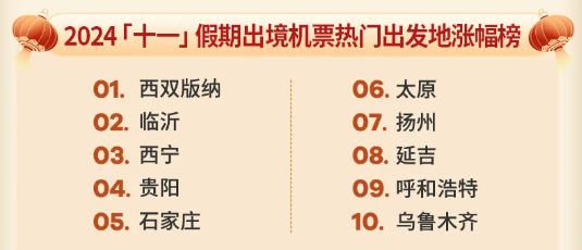 동정려행의 보고 데이터에 따르면 국경절련휴는 다국관광의 고봉기이다. 올해 국경절 련휴기간 동정려행 플랫폼 국제 항공권, 호텔 예약 열기 모두 대폭 상승했다. 시쐉반나, 림기, 서녕, 귀양, 석가장, 태원, 양주, 연길, 훅호트, 우룸치 등 도시가 출국 항공권 인기 출발지 장성폭 차트에 이름을 올렸다.