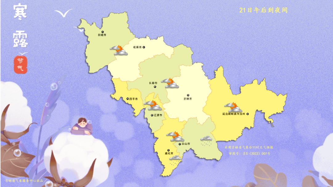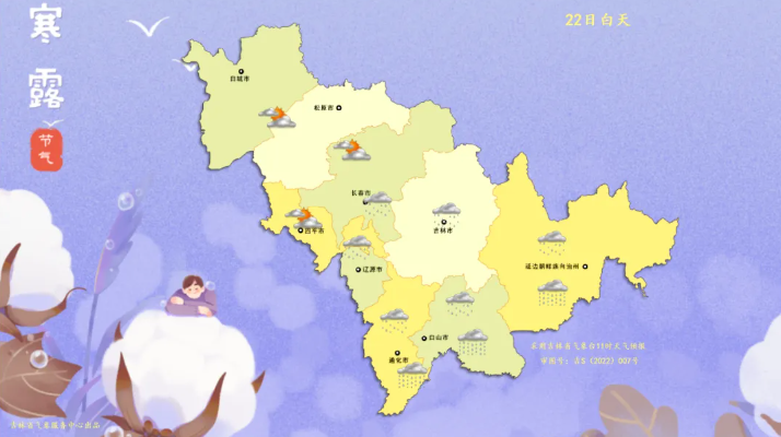 이번 주(10월 21일-27일) 길림성 평균 기온은 5.5℃ 좌우겠고 기복이 클 것으로 보인다. 22일 기온이 하락되였다가 23일에 다시 상승되겠고 22일 길림성 동부에는 뚜렷한 진눈까비 날씨가 나타날 것으로 예상되므로 옷을 따뜻하게 챙겨입길 바란다.