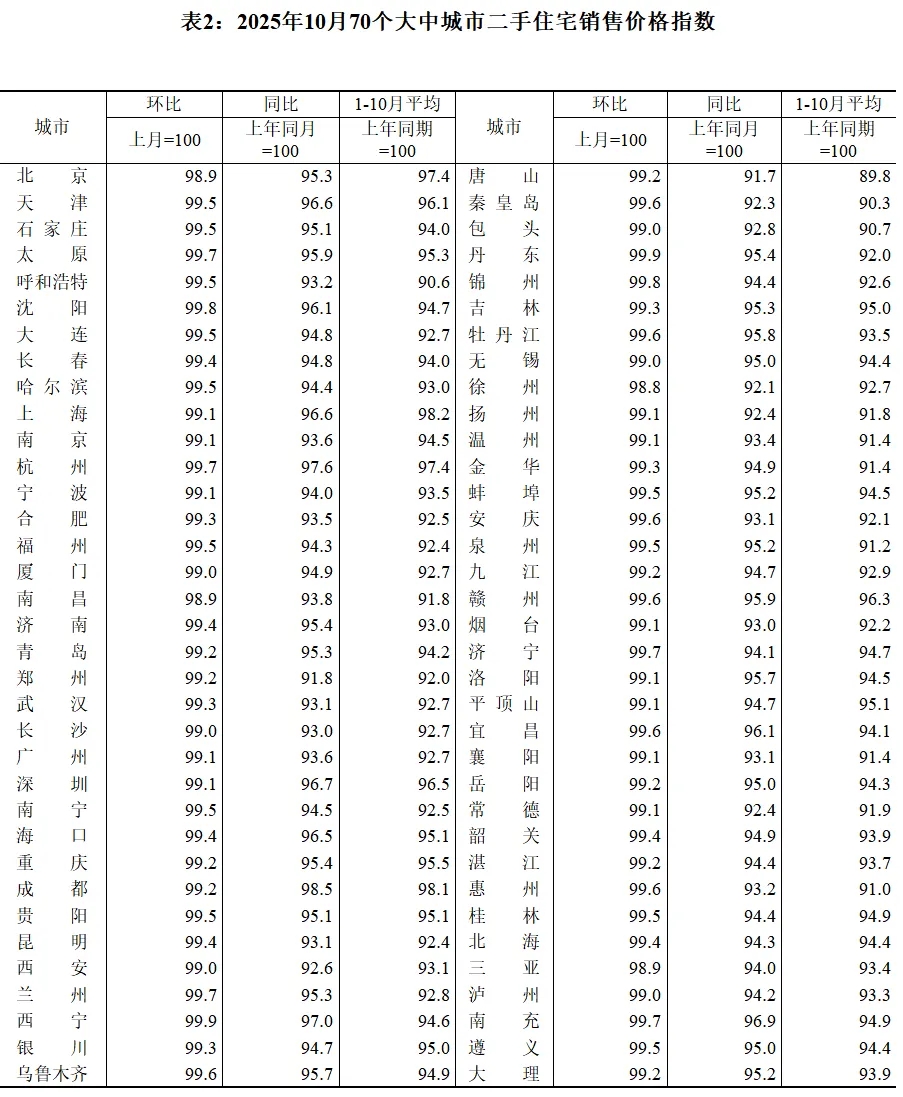 국가통계국은 11월 14일 데이터를 공포했는데 2025년 10월 70개 대중도시 가운데서 각 선 도시의 상품주택 판매가격이 전달과 전년 대비 모두 하락한 것으로 나타났다.