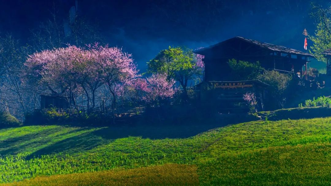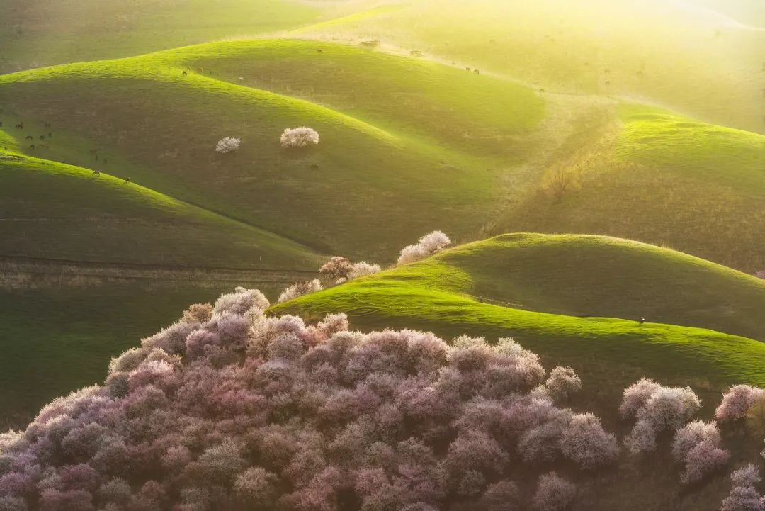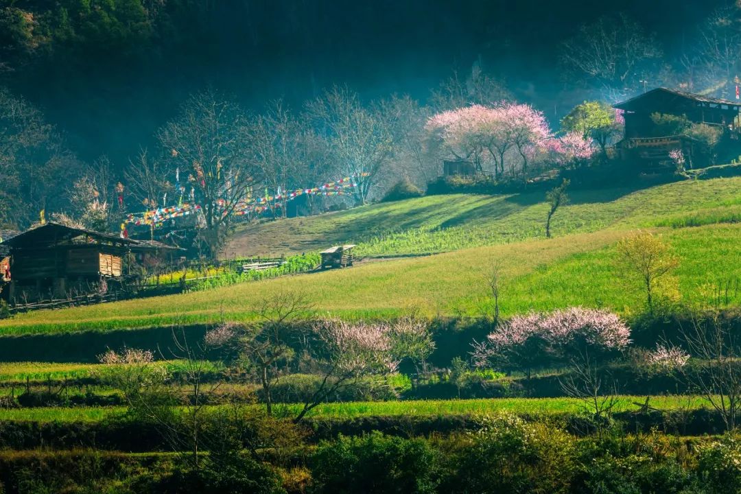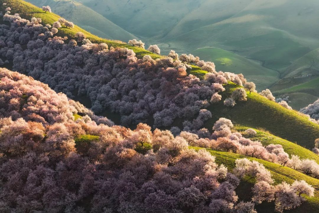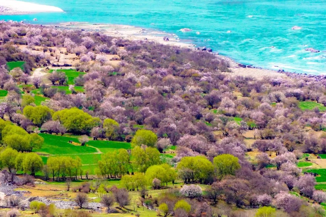 매년 봄, 파릇파릇한 산비탈이 활짝 핀 연분홍 살구꽃으로 가득 차면 마치 무릉도원을 방불케 한다. 어느 각도에서 보아도 울긋불긋한 세계적인 수준의 유화다!