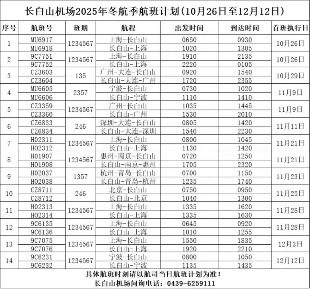 입수한 데 의하면 2025년 겨울항공시즌 장백산공항의 주간계획 항공편이 354편으로 전년 동기대비 6% 증가했다. 이번 시즌에 취항하는 항공사는 6곳으로 남방항공, 동방항공, 춘추항공, 길상항공, 복주항공, 장룡항공이다.