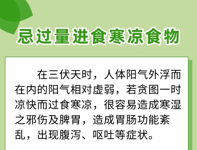 찬 음식을 많이 먹지 말아야복날에는 인체의 양기가 겉으로 드러나는데 내부의 양기가 상대적으로 약하기 때문에 일시적인 시원함을 추구해 너무 차갑게 먹으면 비장과 위장을 손상시켜 위장기능장애, 설사, 구토 등 증상을 일으키기 쉽...