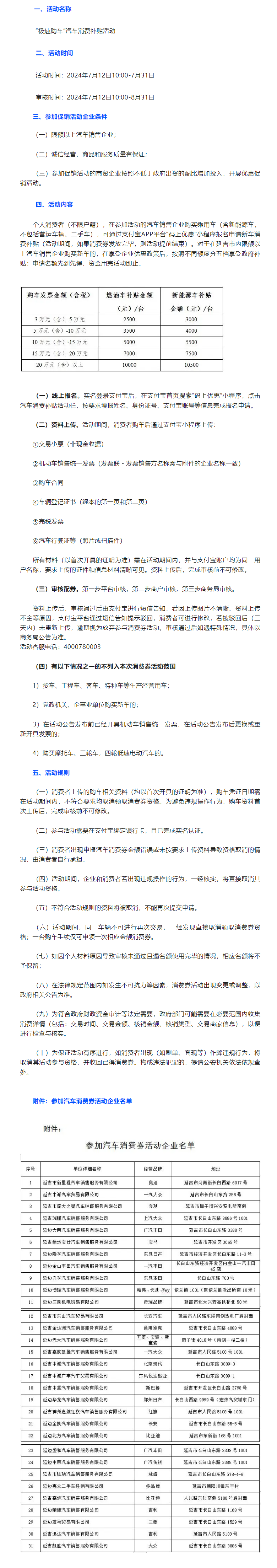 자동차소비시장을 활성화하고 자동차소비의 품질 승격을 촉진하며 자동차시장의 소비잠재력을 일층 자극하고 경제 성장에 대한 소비의 견인역할을 발휘하기 위해 연길시정부는 2024년 7월 12일부터 7월 31일까지 300만원을 투입하여 자동차소비 보조 활동을 전개하기로 결정했다. 구체적인 활동 방안은 아래와 같다.