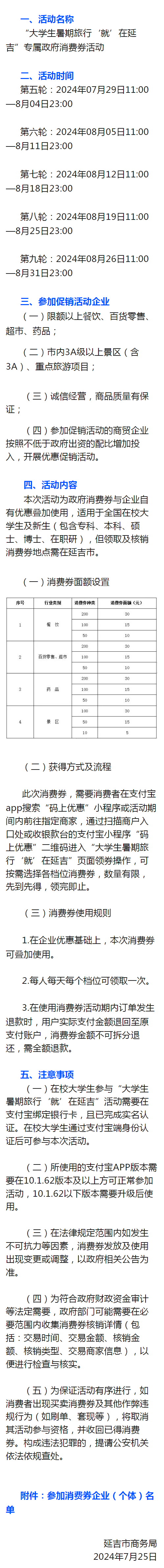 여름철 관광 황금기를 활용하고 '청년연길' 건설을 지속적으로 추진하며 '대학생 여름방학 려행은 연길에서!'라는 브랜드를 홍보하기 위해 연길시정부는 2024년 7월 1일부터 500만원의 정부소비권을 투입하기로 결정했다. 구체 활동방안은 아래와 같다.