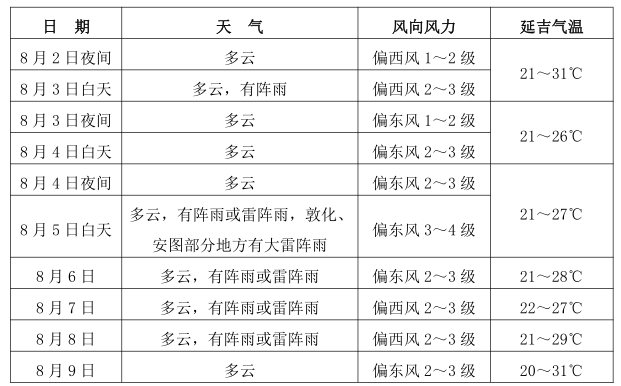 8월 3일 낮 소나기가 내리겠고 5일 낮부터 밤까지 소나기 혹은 천둥번개를 동반한 소나기가 내리겠으며 돈화, 안도 부분적 지역에는 큰 소나기가 내리고 6일-8일 소나기 혹은 천둥번개를 동반한 소나기가 내리겠다.