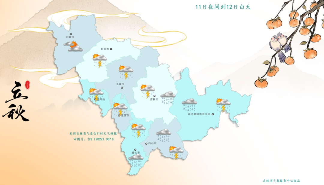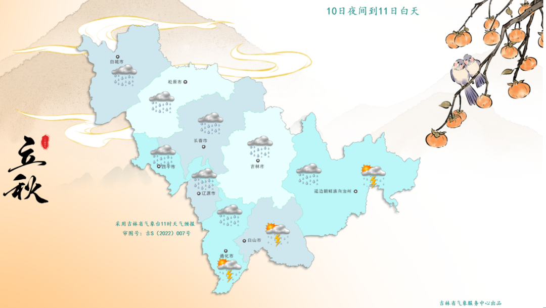 10일 밤부터 11일 낮까지 길림성은 구름이 많다가 점차 흐리겠으며 백성, 송원, 장춘, 사평 대부분 지역, 료원, 길림, 통화 북부, 연변 서부에는 중등 정도의 비 혹은 큰비가 내리겠고 부분적 지역에는 폭우가 예상되는 가운데 단시간내 강한 강수, 천둥 번개, 강풍 등 강대류 날씨를 동반하고 기타 지역에는 소나기 가 내릴 것으로 보인다.