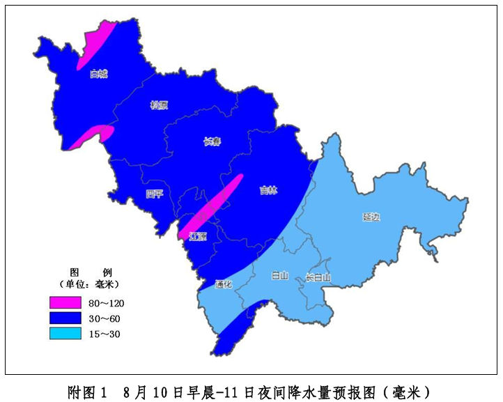고공 랭각 기압골과 저공 절단의 공동영향을 받아 8월 10일 아침부터 11일 밤까지 길림성에는 뚜렷한 강수가 나타나게 되는데 강우 분포가 고르지 않고 비교적 뚜렷한 국지성을 가지게 된다. 강수는 주로 10일 낮부터 11일 낮에 집중되고 길림성 대부분 지역에 큰비가 내리며 부분적 지역에는 폭우 혹은 큰 폭우가 내리겠으며 국지적 단시간내 강한 강수, 천둥 번개, 강풍 등 강대류 날씨를 동반하고 최대 시간당 강우량은 20~50mm에 달할 것으로 보인다. 루계 강수량은 길림성 평균 강수량은 20~40mm, 그중 백성, 송원, 장춘, 사평, 료원, 길림, 통화 북부는 30~60mm에 달할 것으로 예상된다.