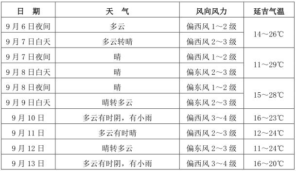 기상부문에 따르면 향후 한주간(9월 7일-9월13일) 연변주 날씨추세는 기온이 다소 높고 강수가 다소 적을 것으로 예상된다. 전 주 평균 기온은 18.0℃ 안팎으로 평년 동기보다 1.6℃ 가량 높겠고 전 주 평균 강수량은 6~12밀리메터로 평년 동기보다 9밀리메터 가량 적을 것으로 예상된다.