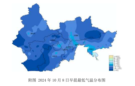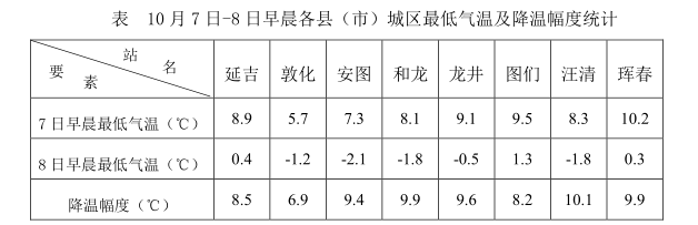 기상부문에 따르면 비교적 강한 찬공기 영향으로 10월 7일 밤부터 우리 주 기온은 뚜렷이 하락되였고 8일 아침에 한파날씨가 나타났으며 24시간 최저 기온은 7℃~10℃ 하락되였는데 최저 기온은 -2.1℃로 안도에 나타났다. 그중 왕청의 강온폭도가 가장 컸는데 10.1℃에 달했다.