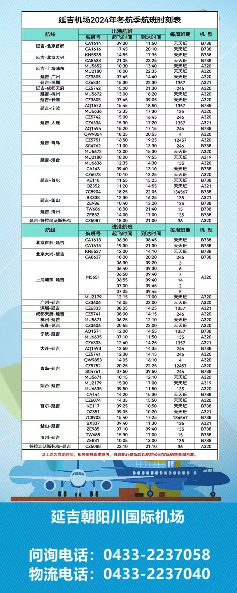 연길조양천국제공항에 따르면 10월 27일부터 연길공항은 겨울항공시즌 항공편계획을 집행하게 된다. 2024년 겨울항공시즌 집행시간은 10월 27일부터 2025년 3월 29일까지 총 22주이다. 려객들의 다원화 출행 수요에 만족주고저 연길공항은 계속해 항로개발 강도를 강화하고 항로 네트워크를 과학적으로 배치하며 항공편 시각을 최적화하고 각 항공사와 적극 소통 조률하여 여러 갈래 항로를 개통, 추가하고 있다.