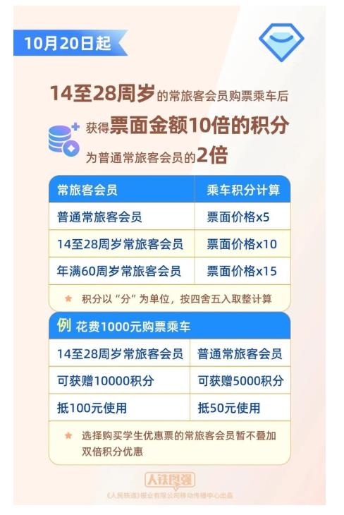 10월 20일부터 중국 국가철도집단유한회사는 ‘철도원활행(铁路畅行)’ 회원서비스를 최적화하고 업그레이드하게 되는데 14세부터 28세 사이의 주민신분증, 향항오문주민거주증, 향항오문주민내지통행증, 대만주민대륙왕래통행증, 외국인영주신분증을 소지한 승객에게 더 큰 폭의 포인트혜택을 제공한다. 회원포인트는 기차표교환을 기반으로 좌석업그레이드 기능이 추가되여 승객들의 포인트 응용범위가 더욱 확장된다. 승객들이 더 많은 혜택을 획득할 수 있어 ‘철도+’ 소비잠재력을 자극하고 인원이동과 연선 경제발전을 촉진하며 전면적인 내수확대에 새로운 동력을 주입하게 된다.
