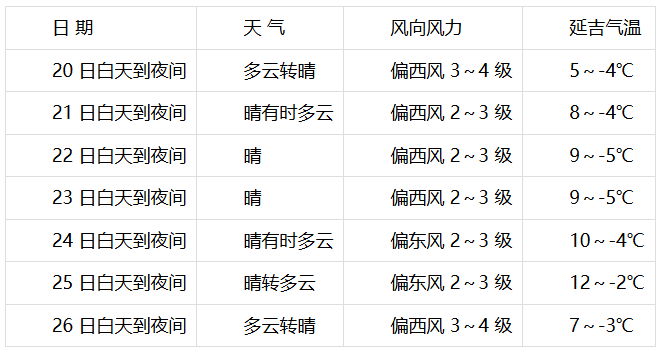 주기상국에 따르면 이번 주 우리 주의 총체적인 날씨추세는 기온이 뚜렷이 낮고 강수가 적을 전망이다. 전 주 평균 기온은 2℃ 안팎으로 평년 동기보다 3.5℃ 가량 낮을 것으로 보인다. 21일부터 기온이 점차 오르겠는데 25일 낮 최고기온은 10℃ 내지 13℃겠으며 26일에 기온이 내려갈 예정이다.