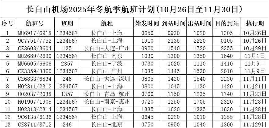 2025년 장백산공항 겨울항공시즌 항공편계획이 일전 출시됐다. 상해, 광주, 녕파, 남경, 심수, 청도 등 여러 인기 로선이 정식으로 개통되였다.