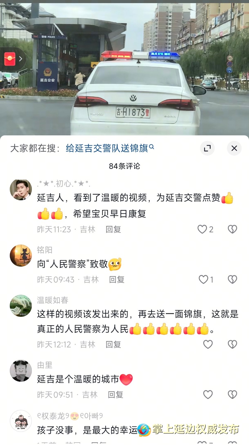 "지금은 아이가 회복되였고 연길 교통민경들에게 꼭 감사의 인사를 전하고 싶습니다!" 이후 아이의 부모는 틱톡 플랫폼에 당시 상황을 공유하며 경찰차 사진을 함께 올렸다. 사실 이날 부모는 아이의 부상 때문에 경황이 없어 급하게 경찰차 사진만 찍었다. 감사의 인사를 전하고 싶었지만 경찰차 사진을 올리는 것이 괜찮을지 고민하다가 결국 인터넷을 통해 감사의 마음을 표현하기로 했다.