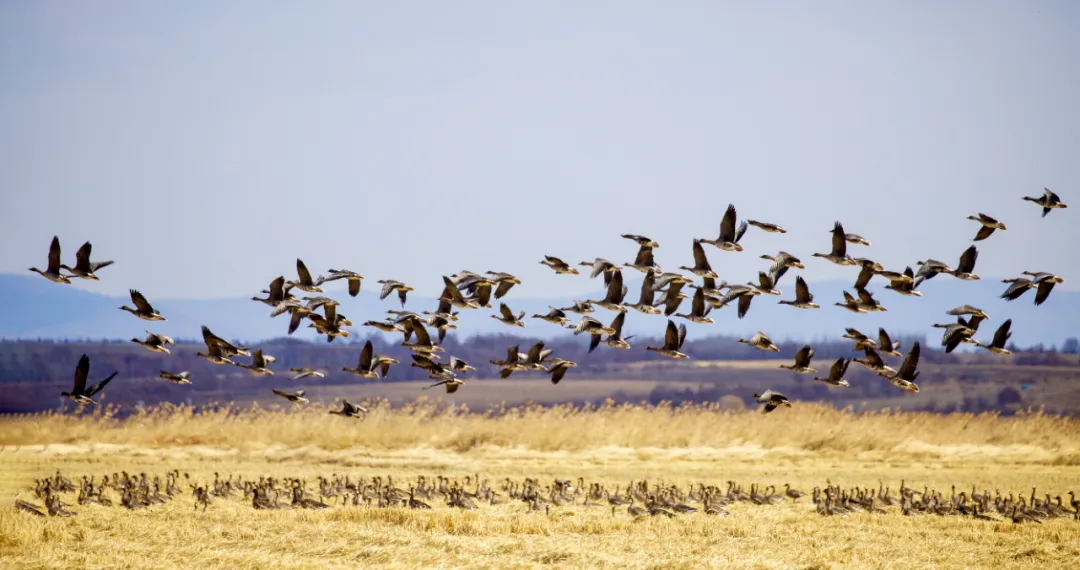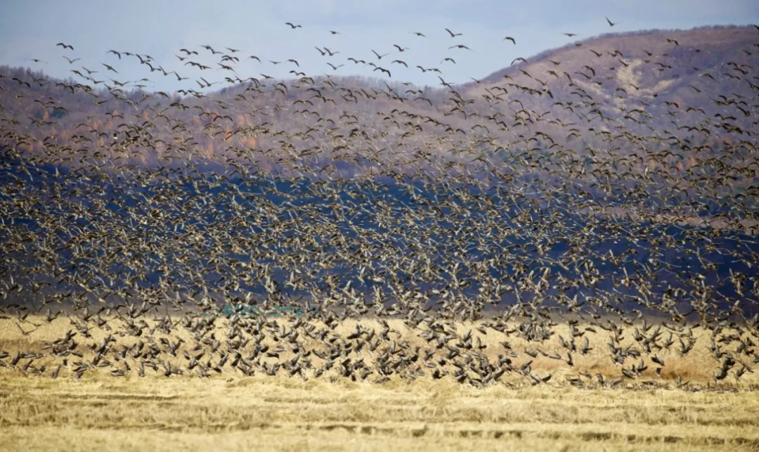 매년 10월 말부터 쇠기러기들이 차례로 이곳에 도착해 휴식을 취하고 에너지를 보충한다. 벼 수확 후 논밭에 남은 곡식들이 이동하는 기러기떼에 풍부한 먹이를 제공한다. 카메라 렌즈를 통해 기러기들이 고개를 숙여 먹이를 쪼거나 날개를 펴고 선회하는 모습이 포착됐고 기러기들의 맑은 울음소리가 들녘에 울려 퍼졌다.