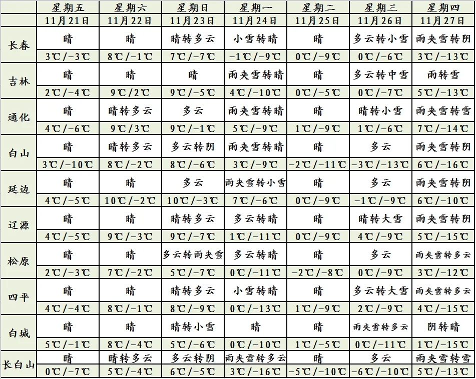 길림성기상국 최신 예보에 따르면 11월 21일부터 27일 사이, 길림성에 두차례에 강설과 강온 과정이 찾아올 것으로 예상된다.
