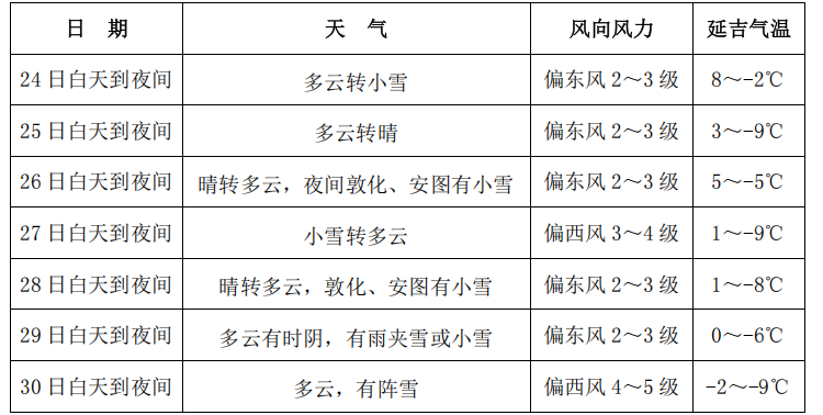 우설날씨에 대비해 각지에서는 교통안전관리를 강화하고 도로제설작업을 제때에 실시하는 한편 에너지 공급보장을 잘해야 한다. 각지에서는 시설농업관리를 강화해 온실남새의 랭해를 예방하고 열공급 기업과 단위들에서는 날씨변화에 따라 열공급 강도를 과학적으로 조절해야 한다. 24일부터 27일 사이, 29일의 기상조건이 대기 오염물질의 확산과 제거에 불리하므로 석탄으로 난방을 하는 주민들은 실내환기를 잘해야 한다.