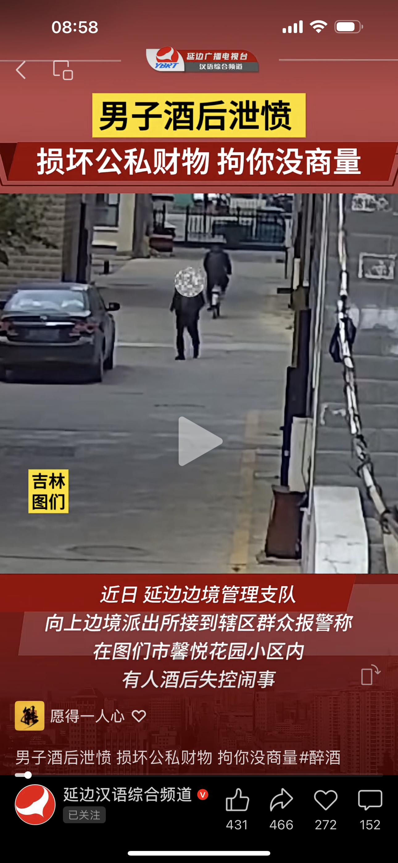 술김에 길가에 주차되여 있는 차량을 발로 차고 공공시설과 주차되여 있는 자전거를 마구 넘어뜨린 남성이 일전 연변변경관리지대 향상변경파출소 민경들에게 단속됐다.