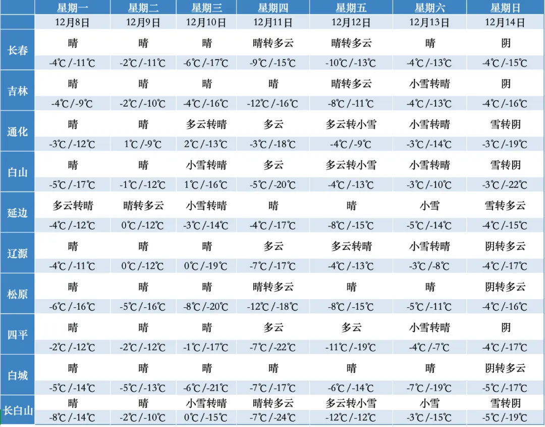 기상부문에 따르면 이번 주 길림성은 강설, 강온이 동시에 찾아오고 기온변화가 심할 예정이다.