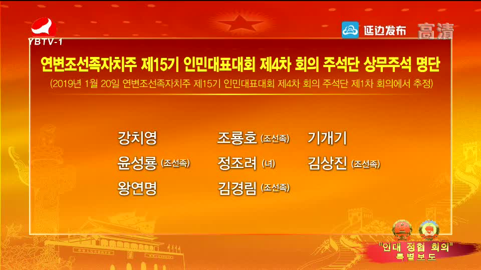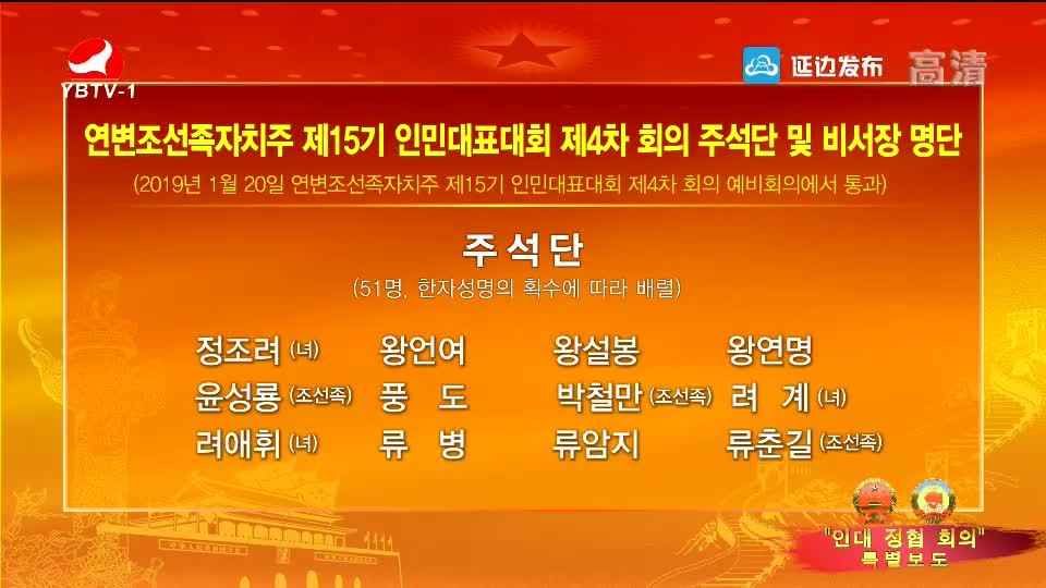 연변조선족자치주 제15기 인민대표대회 제4차 회의 주석단 및 비서장 명단