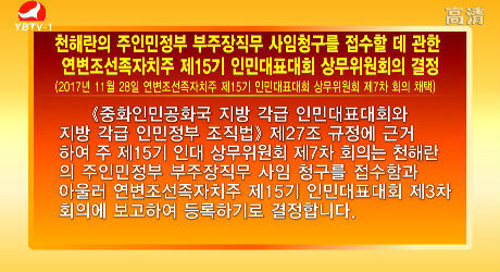 천해란의 주인민정부 부주장직무 사임청구를 접수할 데 관한 연변조선족자치주 제15기 인민대표대회 상무위원회의 결정