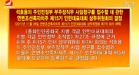 석호용의 주인민정부 부주장직무 사임청구를 접수할 데 관한 연변조선족자치주 제15기 인민대표대회 상무위원회의 결정